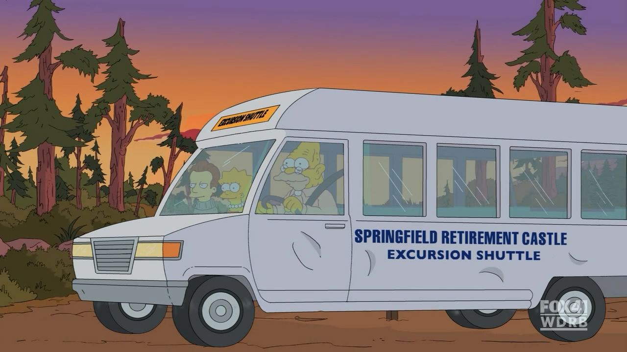 Springfield Retirement Castle Excursion Shuttle is a bus that takes seniors from Springfield Retirement Castle on excursions.
