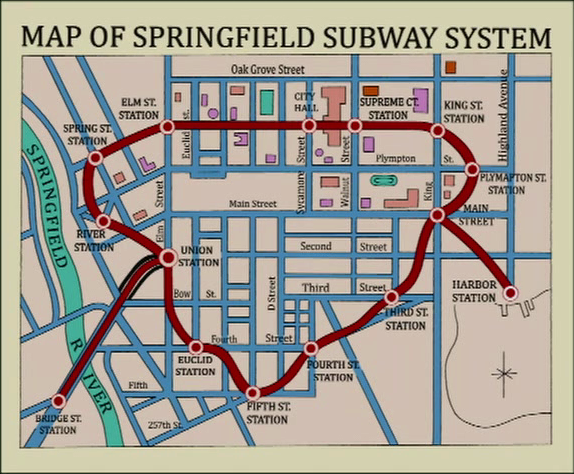 The Springfield Subway System is an abandoned underground railway network running beneath Springfield. Although the trains are functional, they are no longer in use (at least in a part of the underground segment), due to the damage caused to buildings by the tremors of the moving train. However, an elevated segment is most likely still in use. The tracks pass underneath Springfield Elementary School, and caused severe damage to the structure of the building when Bart and Milhouse operated one of the trains. Bart Simpson and Milhouse rode on the Subway in “Postcards From the Wedge”
