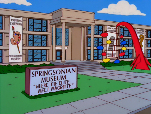 The Springsonian, described as "where the elite meet Magritte", made its debut in the episode Lost Our Lisa and at the time was hosting art, architecture and sculpture exhibitions. The Springsonian was also welcoming visitors to its limited engagement Egyptian Treasures of Isis exhibit, which included the Orb of Isis on display.