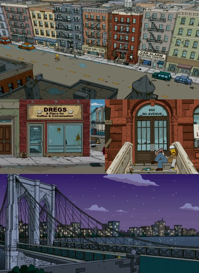 Sprooklyn is a parody of Brooklyn, a borough of New York City. Its name is a portmanteau of "Springfield" and "Brooklyn".