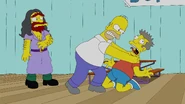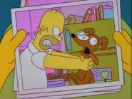 - When Bart reveals that he defaced a picture of Homer to look like Flanders out of spite, Homer furiously shouts "Why you little! I'll strangle-angle you!", tackles Bart and angrily strangles him while he waves the picture in his face.