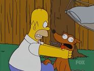 - In Today, I Am a Clown, when the Simpsons learn Santa’s Little Helper had puppies again, Lisa mentions they had him neutered afterwards. Homer recalls he was supposed to have the dog neutered but decided he wouldn't go through with it, provided he never did it again and when the flashback ends Homer is angrily strangling Santa's Little Helper, furiously shouting "You broke our deal! We had an oral contract!" with the rest of the family trying to pull them apart. Later, when Bart says that Homer lost his stranglehold on the audience by taking Lisa’s advice Homer furiously shouts "I'll audience you!" and angrily strangles him. As Hibbert and his family watches this happen on TV, Hibbert replies by saying "So that's why Bart has all those broken tracheal bones. Tight bowtie, my ass!" This is likely the first time Homer has strangled Bart and another character within the same episode.