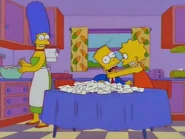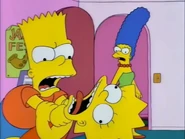- In "Thrifty Ways to Thieve Your Mother" when Lisa said barely, Marge shouts "Why, you little...." and tried to strangle Lisa, but Bart intervened and pushed Marge away from Lisa.