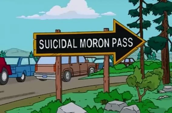 Suicidal Moron Pass is where Homer took a "shortcut" home. It's off Rural Route 9. Marge also took this route back home. It is a dangerous and underdeveloped road that features hills, a forest, animals, and a cliff.