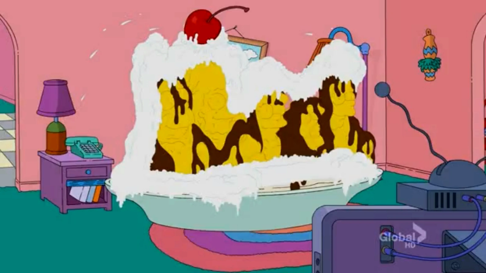 The couch is an ice cream bowl. An arm releases five scoops of ice cream that resembles the Simpsons into the bowl, then tops the ice cream with chocolate syrup, whipped cream and a cherry. Santa's Little Helper (who's gigantic) comes in, sniffs it, and happily licks the sundae, while taking scoops of the ice cream away. After he finishes, he burps as he leaves the room.