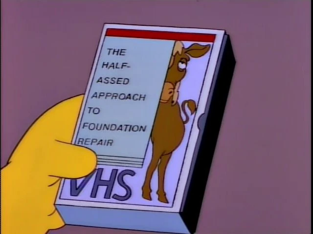 The Half-Assed Approach to Foundation Repair is a Troy McClure video that teaches the process of fixing foundations. Homer Simpson rented the video when his house's foundation needed repair, but found it too hard to follow.