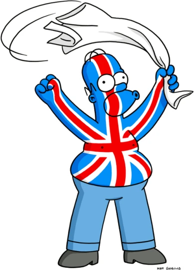 Marge is astonished that Homer is behaving himself. They rent a Mini Cooper and start to drive around London. Unfortunately, they get stuck on a roundabout. After driving in circles for hours, Homer decides to break out of it, plows straight through the gates of Buckingham Palace and slams into Queen Elizabeth II's horse-drawn carriage. Unaware of whom he has just knocked down, he tries to brush the incident under the carpet, but the Scots Guardsmen start beating him with cudgels. Then comes the Changing of the Guard, and the new Scots Guardsmen continue to beat him mercilessly. This apparently continues until they run out of Guards.