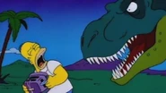 They prey on the pteranodons, leaellynasaura, ankylosaurus, dimetrodons, parasaurolophuses stegosauruses, struthiomimuses, apatosauruses, and triceratopses. The T-Rex was first seen in Treehouse of Horror V, when he attacks Homer after he travels in time of the dinosaurs. He dies from Homer's sneeze, as the other Dinosaurs fall dead from the same sneeze.