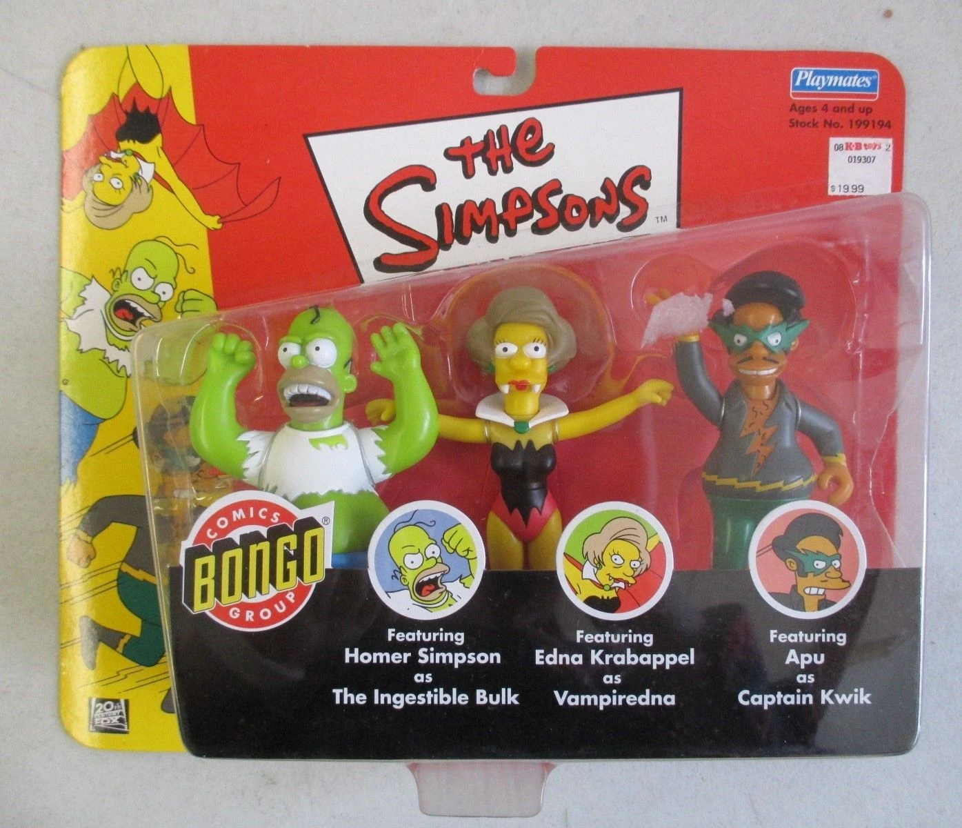 Again, technically not considered part of the World of Springfield line (although there is debate about that among collectors), Playmates Toys released a series of figures exclusive to Kay Bee Toys based on the "When Bongos Collide" story line from Bongo Comics in August 2002. It featured Simpsons characters transformed into superheroes. The initial three-pack of figures included Homer Simpson as the Ingestible Bulk, Apu Nahasapeemapetilon as Captain Kwik, and Edna Krabappel as Vampiredna. Two more three-packs were planned (featuring Marge as the Entangler, Lisa as the Jazzler, Maggie as BrainBaby, Grampa as Oldblood member Coma, Skinner as The Stickler and Willie as the Plaid Piper), but the line was cancelled as soon as it hit retail.